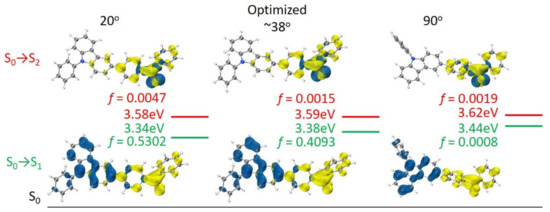 The natural transition orbitals (NTOs) were analyzed using the Multiwfn program to explore the photophysical properties in their excited states [28]. The blue and yellow isosurfaces in Figure 5 represent hole and electron distributions, respectively. f represents the oscillator strength for excitations, a high value of which is necessary for efficient emission [29]. In the lowest S1 states, the holes of BP-3-Cz are mainly concentrated in the N-phenylcarbazole, whereas the electrons disperse mostly on the benzophenone, which indicates an ICT transition. In S2 states, BP-3-Cz obviously exhibits a n-π* transition, mainly on the benzophenone. Too-large twist angles (such as 90°) between the carbazole and benzophenone produce a pure ICT (S0 → S1) with total spatial separation of orbitals at a higher energy level (3.44 eV), which is closer to that of dark (n, π*) (S0 → S2 3.62 eV). Therefore, the electron transition is almost suppressed due to both the low f (0.0008) of S0 → S1 and proximity effect of dark S2 to S1. Weak or even quenched emission will be observed in the highly twisted conformation of BP-3-Cz. With a decrease in the torsion angle, a few holes and electrons are extended to the benzophenone and carbazole, respectively. Thus, the increased orbital overlap in the excited state facilitates the radiative transition and leads to higher f at low twist angles (0.5302 at 20°). Meanwhile, the energy level is decreased to 3.34 eV, which is farther away from that of dark (n, π*). Consequently, the relatively smaller torsion angle and more planar conformation help maintain stronger fluorescence. The strong fluorescence of BP-3-Cz in high-polarity solvents infers that the high polarity could induce a more planar structure and larger conjugation to achieve a more stable PICT with a decreased S1 energy level, which is far from that of S2 (n-π*) [18].