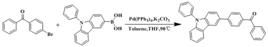 All chemicals were purchased from commercial sources and used without further purification, including 9-phenyl-9H-carbazol-3-ylboronic acid (98%), 4-bromobenzophenone (98%), Pd(PPh3)4 (99%), potassium carbonate (98%), anhydrous magnesium sulfate (99.5%), etc. All the other solvents are commercially available and used as received, unless otherwise claimed.