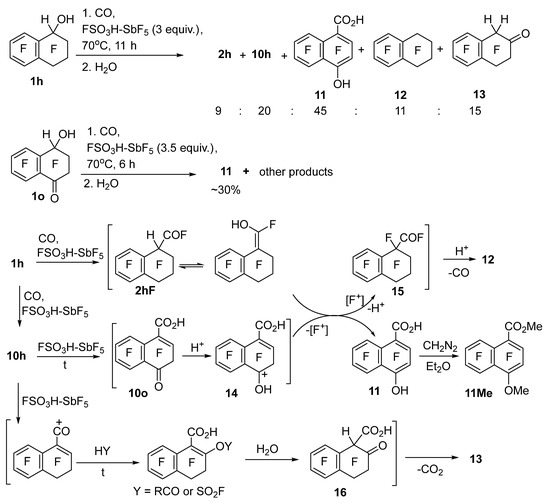 The interaction of tetralinol 1h with CO in FSO3H–SbF5 at 70 °C (Scheme 3), in contrast to the analogous reaction of indanol 1i (Table 3, entry 9), did not generate the corresponding ketoacids. The main product was naphthalenecarboxylic acid 11; in addition, the reaction mixture contained acids 2h and 10h, perfluorotheralin (12), and tetralon 13. Acid 11 was isolated as dimethylated derivative 11Me after treatment of the reaction mixture with diazomethane. Carbonylation of hydroxyketone 1o under similar conditions resulted in a complex mixture of compounds, among which acid 11 was the main one as well (Scheme 3).