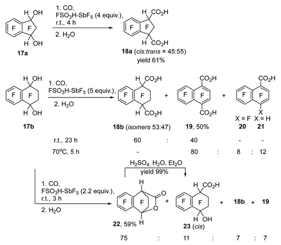 Carbonylation of diols 17a and 17b in FSO3H–SbF5.