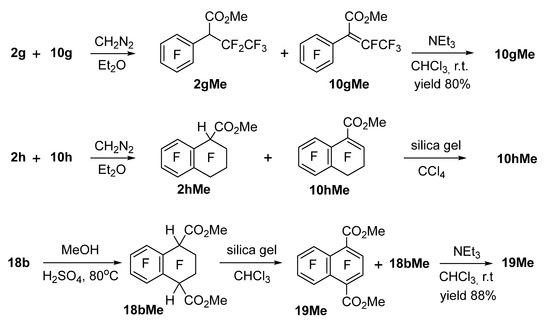 In some cases, esterification was performed to isolate and purify carboxylic acids obtained in carbonylation reactions. Furthermore, the feasibility of conversion of several acids and esters into α,β-unsaturated derivatives by elimination of HF was tested. Thus, mixtures of esters 2gMe + 10gMe and 2hMe + 10hMe were obtained by the reaction of the respective acid mixtures with diazomethane (Scheme 5). Ester 2gMe could be smoothly converted into product 10gMe under the influence of NEt3 in chloroform; elimination in ester 2hMe proceeded fully, even during column chromatography on silica gel. Esterification of a mixture of diacids 18b and 19 with methanol in the presence of H2SO4 made it possible to selectively obtain ester 18bMe because acid 19 became esterified much more slowly. Nonetheless, the purification of ester 18bMe by silica gel chromatography afforded a mixture of esters 18bMe and 19Me, owing to partial elimination of HF; treatment of the obtained mixture with NEt3 in chloroform led to ester 19Me as the only product.