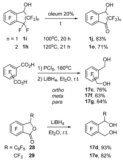 Carbonyl derivatives 1j and 1o were synthesized by the heating of alcohols 1i and 1h with 20% oleum (Scheme 8). Diols 17c,f,g were derived from the corresponding isomers of dicarboxylic acids, which were first converted into diacyl chlorides via a reaction with PCl5 and then reduced with LiBH4. Diols 17d and 17e were obtained by reduction of phthalides 27 and 28 with LiBH4. The other starting compounds were prepared according to literature data: alcohols 1a,b [68], 1c,g,h,i,k,l,m,n and 17a,b [69], 1d [70], 1e [71], 1f [72], and phthalides 28 [73] and 29 [74].