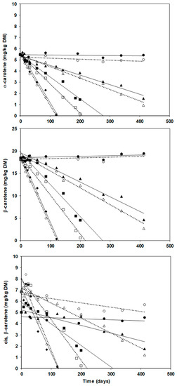 To determine the degradation reaction order of each carotenoid, both zero- and first-order kinetics were hypothesized by applying the general reaction rate expression , where C is the concentration of the compound (mg/kg DM), k is the reaction rate constant, t is the reaction time (days) and n is the order of the reaction [42]. The order with the best correlation (r) and the best correspondence among the experimental values and the half-life of the compound (t1/2) [time for the concentration of a reactant to fall to half its initial value; for zero order where C0 is the initial concentration, and for first order)] was selected. The temperature dependence of the reaction rate was determined by the Arrhenius equation, , where Ea is the activation energy of the reaction (kJ/mol), A is the pre-exponential factor, R is the gas constant (8.314 J/mol·K) and T is the absolute temperature (K). The z value represents the increase in temperature that leads to a 10-fold increase in the reaction rate.