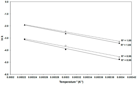 The Arrhenius plot (Figure 2) illustrates the effect of temperature on the degradation rate constants: the absolute value of the slope of the line is directly proportional to the activation energy (Ea) whose higher value implies closer relationship between variation of temperature and degradation [28].