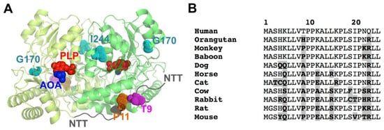 Structure of AGT and the location and conservation of T9 and P11 in the NTT. (A) Structural model of the AGT dimer, based on PDB 1H0C []. The figure shows the two monomers in the dimer (in two different green tones), the PLP and the inhibitor AOA (amino oxo-acetic acid) as red and blue spheres, respectively; the location of the NTT (in dark grey) with the residues T9 (pink) and P11 (orange) and the PH1 mutated residues in G170R and I244T (in cyan). (B) Evolutionary conservation of the 25 N-terminal amino acids of human AGT. Sequences are from mammalian ortologues. Residues in bold and highlighted in grey are those diverging from the human sequence. Note that T9 is only found in the human sequence, whereas P11 is strictly conserved.