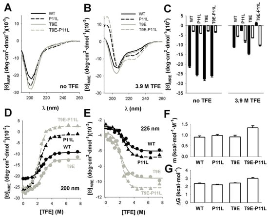 To assess whether these amino acid changes would affect the thermodynamics of the disorder-to-order transition, we performed titrations of the peptides with different concentrations of TFE that supported a two-state-like behavior for these transitions (Figure 2D,E and Figure S2). Global fitting of the CD signals at 200 and 225 nm to Equations (2) and (3) [,] (Figure 2D,E) provided similar folding free energies for all peptides (Figure 2G, Table S9), although the transition for the peptide containing both mutations (T9E and P11L) was more cooperative (i.e., higher m-value), in agreement with a higher degree of ordered structure in the presence of TFE (Figure 2F). Intriguingly, the isodichroic point found in these titrations was ~212 nm (Figure S2), a value somewhat higher than those reported for the random coil-to-α-helix transitions in short peptides (~203 nm) [].