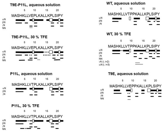 In an early study, the overall conformation of the NTT-AGT peptide was evaluated at pH 7.0 in the absence or presence of 50% TFE. The results obtained showed a very low tendency of this peptide, even in the presence of the P11L polymorphism, to adopt ordered conformations, based on results from far-UV CD []. In our opinion, the most interesting result from this study was the finding of an unnatural mutation (P11L) that enhanced the content in ordered structure of the NTT-AGT peptide, which was also capable of driving a construct fused with a green fluorescent protein (NTT-AGT-GFP) to mitochondria. The authors proposed that the increased content in α-helical structure in the NTT was connected to the mitochondrial mistargeting of the full-length AGT (i.e., in the LM-G170R variant). In our study, we carried out a comprehensive experimental characterization (by far-UV CD and NMR), combined with statistical mechanical calculations, which shows that the phosphomimetic T9E mutation also shifts the conformational equilibrium (particularly in the presence of P11L) from disorder to ordered substates, with some weak content in the α-helix or β-turn like conformations.