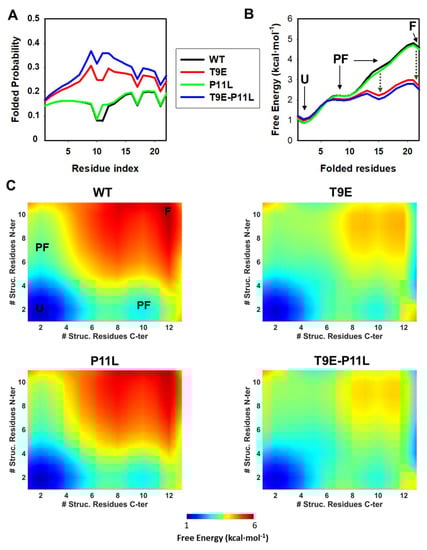 We first evaluated the probability of folded residues existing along the sequence of NTT-AGT peptides (Figure 4A). The mutation T9E increased the folding probability along the entire peptide, whereas P11L only slightly increased the probability locally (i.e., at P11), with a synergic effect of both mutations on such folding probability. Secondly, we calculated the free energy levels for the four NTT-AGT peptides along a simple reaction coordinate (i.e., the number of folded residues) (Figure 4B). These calculations suggested that the most stable macrostate for the NTT-AGT WT peptide is the unfolded state (U), and two different partially folded (PF) and a folded (F) state were populated along the folding of the peptide with increasing free energies (particularly the F state). These results also suggest that the PF and F states had different free energy levels, with free energies differing by ~1.5 and ~3 kcal·mol−1 (Figure 4B), values close to the overall free energy obtained experimentally for the disorder-to-order transition in the presence of TFE (~2–3 kcal·mol−1; Table S9). This scenario was not quantitatively or qualitatively affected by the P11L mutation alone. The peptide containing the mutation T9E also showed these four macrostates, but strongly stabilized the two most unstable and more folded states found in the NTT-AGT WT peptide, whereas the two mutations together slightly enhanced these effects. A two-dimensional representation, in which the structural order of the N-terminal and C-terminal halves of the NTT-AGT peptide were analyzed, also showed some interesting differences. In the NTT-AGT WT peptide, the two PF states showed quite localized ordered ensembles, with uncoupled folding of the N-terminal and C-terminal sections (Figure 4C, WT). The presence of the T9E mutation had two important effects (Figure 4C, T9E): (1) the structure of the PF macrostates shifted towards more ordered conformations (with the unfolded half now partially folded); and (2) highly ordered substates (close to the F macrostate) were strongly stabilized.