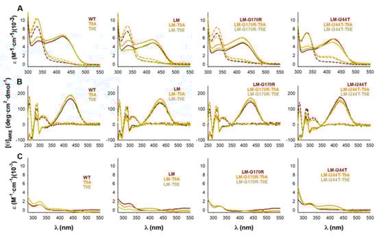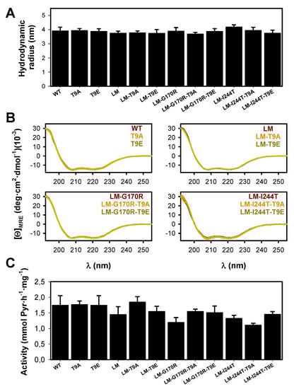 As we have shown in the study of the isolated peptides, the phosphorylation of T9 seemed to change the conformational space of the region around this residue; therefore, we wondered whether the phosphomimetic mutation T9E could affect the conformation and activity of the AGT protein. We introduced this mutation, as well as the negative control T9A, in four different backgrounds: two non-pathogenic (WT and LM) and two pathogenic (LM-G170R, primarily associated with mitochondrial mistargeting, and LM-I244T, primarily associated with peroxisomal aggregation). The T9A is a negative control, since it does not introduce the phosphomimic glutamic mutation in the proteins. All 12 possible variants were expressed in, and purified from, E. coli using standard procedures [,].