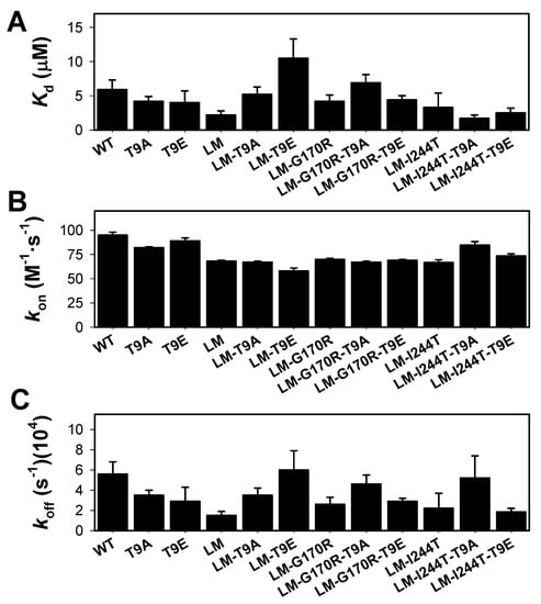 PLP binding to apo-AGT variants (WT, LM, LM-G170R, and LM-I244T) in the absence or presence of the T9A or T9E mutations. (A) Apparent dissociation constants for PLP binding; (B,C) Association (kon, panel B) and dissociation (koff, panel C) rate constants for PLP binding. PLP binding was monitored by quenching of apo-AGT intrinsic fluorescence under pseudo-first order conditions ([PLP] > >[Apo-AGT]). Experiments were performed in HEPES-NaOH 20 mM, NaCl 200 mM, pH 7.4, and 25 °C. Errors are those from fittings or from propagation for Kd.