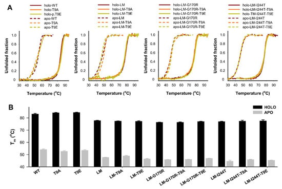 Thermal stability of apo- and holo-AGT variants (WT, LM, LM-G170R, and LM-I244T) in the absence or presence of the T9A or T9E mutations. (A) Thermal denaturation profiles monitored by intrinsic emission fluorescence; (B) Average (±s.d.) for half-denaturation temperatures (Tm values) from at least four replicas for each variant. Experiments were performed in HEPES-NaOH 20 mM, NaCl 200 mM, pH 7.4, and 25 °C. Protein concentration was 2 µM (in protein subunits).