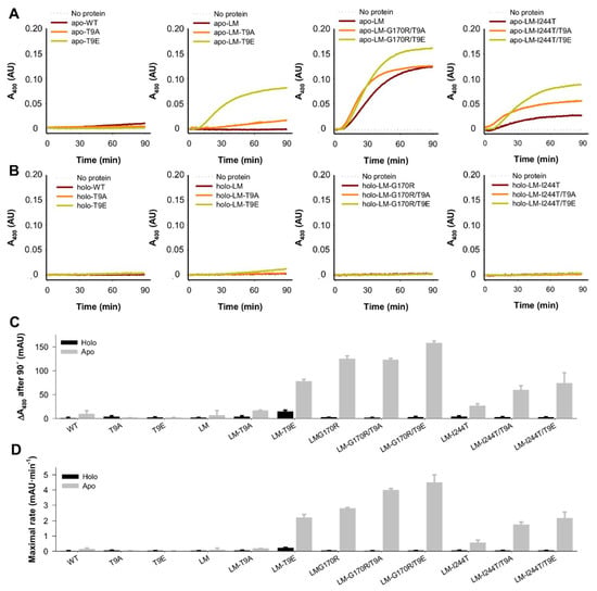 In contrast to experimental analyses described in Section 2.2 and Section 2.3, we observed some effects of the mutations T9E and T9A, which depended on the background variant (WT, LM, LM-G170R, and LM-I244T) (Figure 9A,B). We extracted two different parameters from these experiments: the extent (scattering at 400 nm after a 90 min incubation) and maximal rate (as the maximal value of the first derivative of scattering vs. time) of aggregation (Figure 9C,D). Both parameters provided similar results. None of the variants showed significant aggregation in the holo-state (Figure 9B–D). Interestingly, the mutations T9E and T9A had no effects on apo-WT, whereas they affected the aggregation of apo-LM, apo-LM-G170R, and apo-LM-I244T in different manners. T9A enhanced the aggregation of apo-LM by ~2.5-fold, while this effect was 10-fold larger for T9E. G170R enhanced the aggregation of AGT-LM by 15-fold, while the addition of T9A had no effect, and the mutation T9E slightly enhanced the aggregation of apo-AGT-LM-G170R. The mutation I244T enhanced the aggregation of apo-LM by 4-fold, whereas the mutations T9A and T9E enhanced the aggregation of apo-LM-I244T by 2- and 3-fold, respectively.