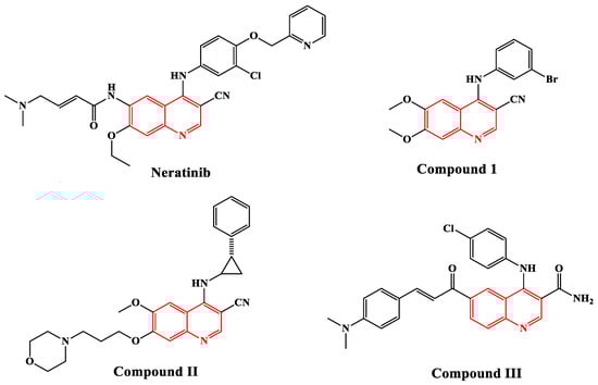 In addition, quinolinone is an intriguing fused heterocyclic scaffold that is found in several FDA-approved and commercialized anticancer medications [10], including Neratinib (Nerlynx®), an EGFR-TK inhibitor [11] (Figure 1). Moreover, several quinolinone scaffold-containing compounds are potent EGFR inhibitors. Compound I has an EGFR IC50 of 0.0075 µM [12], compound II has an EGFR IC50 of 5 nM [13], and compound III has an EGFR IC50 of 5.2 µM [14,15] (Figure 1).