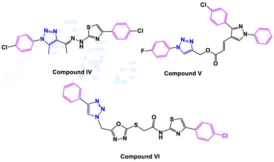Currently, 1,2,3-triazoles exhibit a diverse set of biological actions [16,17,18,19]. They possess various pharmacological and biological features, including anticancer action [20]. Additionally, the importance and applications of 1,2,3-triazole compounds have increased [21,22], after development of the reactions of organic azides with terminal alkynes under mild conditions catalyzed by Cu(I). Further, the regioselective formation of 1,2,3-triazoles using Cu-catalyzed [3 + 2] cycloaddition has proved to be the best example of click chemistry with extensive applications in organic and medicinal chemistry [23]. However, several investigations have shown that their biological features are attributable to the triazole moiety’s making of hydrogen bonds, dipole–dipole, and stacking interactions, which warrant the development of stable complexes and, as a result, activate a cascade of metabolic activations such as apoptosis [24,25]. As a result, the antiproliferative activity of 1,2,3-triazole derivatives is explained by different mechanisms of action. Perihan and coworkers, for example, used a multi-target design technique to develop various 1,2,3-triazoles, one of which, compound IV (Figure 2), has been demonstrated to arrest the G2/M cell cycle and induce apoptosis in human cancer cells [26]. In addition, Khan and colleagues [27] described novel diphenyl-1H-pyrazole-based acrylates linked to 1,2,3-triazole V (Figure 2) as prospective apoptosis-inducing cytotoxic agents.