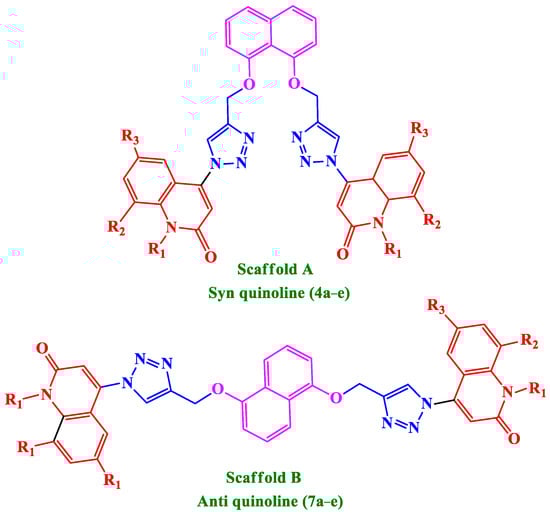 Motivated by the facts presented here, we present the synthesis of a small set of quinoline-1,2,3-triazole hybrids that will be evaluated for antiproliferative activity. The newly synthesized compounds consist of two scaffolds: Scaffold A (4a–e), which represents Syn-like-quinoline derivatives, and Scaffold B, which represents Anti-like-quinoline derivatives 7a–e, Figure 3. The two ligands of triazole and quinolinone moieties attached to the naphthalene core of Syn and Anti conformation-like represented diversity in the field of biology.