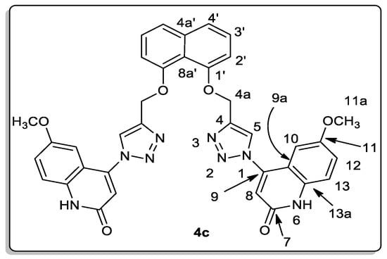 To confirm our obtained products, NMR, mass spectrometry, and elemental analysis were performed for all obtained products. All spectral data for synthesized products 4a–e, clarify that they are formed from two molecules of compounds 1a to e and one molecule of terminal alkyne 2 in a molar ratio (2:1) without any elimination. To rationalize our results, we choose compound 4c which assigned as [4,4′-(((naphthalene-1,8-diylbis(oxy))bis(methylene))-bis(1H-1,2,3-triazole-4,1-diyl))bis(6-methoxyquinolin-2(1H)-one)] (Figure 4).