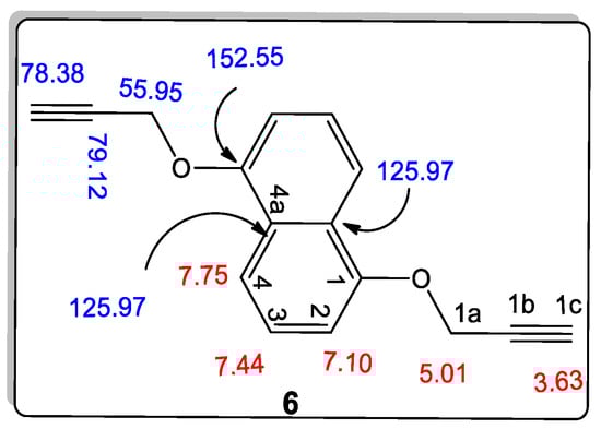 The structures of 1,5-bis(prop-2-yn-1-yloxy)naphthalene (6) were confirmed using different spectral data such as 1H NMR, 13C NMR, 2D-NMR spectrum, as well as mass spectrometry. For example, it exhibited a molecular formula of C16H12O2, which was compatible with its m/z = 236. Through the different data, we found that compound 6 fits perfectly with the previous compound 2 with a slight difference in the chemical shift’s values in its 1H NMR spectrum, and it also contains eight lines in this 13C NMR spectrum, while the previous compound 2 contains nine lines in this 13C NMR spectrum (Figure 5). In the 1H NMR spectrum of compound 6, three doublet signals appeared at δH 7.75, 7.10, and 5.01 ppm, assigned as H-4, H-2, and –OCH2, respectively. The doublet–doublet signal at δH 7.44 ppm gives HSQC and HMBC correlation with the carbon at δC 125.43 ppm., which is assigned as C-3, and this proton was assigned as H-3. This compound contains only one carbon signal at δC 125.97 ppm, which gives HMBC correlation with both signals at δH 7.75, 7.44, and 7.10 ppm., so it must be C-4a. Further, the 13C NMR spectrum showed other signals at δC 152.55, 106.74, 79.12, 78.38, and 55.95 ppm, which were assigned as C-1, C-2, C-1b, C-1c, and –O-CH2, respectively.
