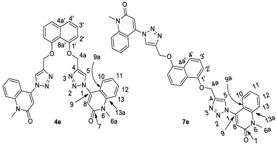 To confirm our results, we choose compound 7e which was assigned as [4,4′-(((naphthalene-1,5-diylbis(oxy))bis(methylene))bis(1H-1,2,3-triazole-4,1-diyl))-bis(1-methylquinolin-2(1H)-one)]. Elemental analysis and all spectral data were acceptable with this proposed structure with chemical formula C36H28N8O4 (m/z = 636). Through the interpretation of the various analyses that were conducted for compound 7e and all the previous compounds, it is undoubtedly clear that the proposed chemical composition is correct, and also, to prove the composition in another way, it was compared with spectral data for its analogous compound 4e (Table 1). This is claimed to be the reaction product of 1,8-bis(propargyloxy)naphthalene (2) with 4-azido-1-methyl-1H-quinolin-2-one (3e). Additionally, the spectra are consistent with structure 7e but are very similar to those observed for sample 4e, for which 4e was assigned. The spectroscopic difference between these products is that, in 4e, C-4a’ and C-8a’ are nonequivalent, while in 7e, these two carbons are equivalent. However, in both compounds 4e and 2, C-8a’ was assigned as co-resonant with another carbon which could not be observed separately. Therefore, we suspect that the correct structure for both products is 4e; see Table 1. In addition, all spectroscopic analyses of all quinolin-2-one rings are completely identical to what was previously published [37,38,39].