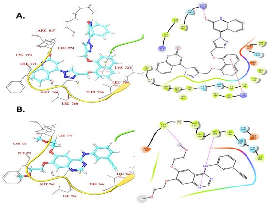 Binding interaction of compound 4a (A) and reference compound Erlotinib (B) in the ATP binding cavity of EGFR kinase domain.