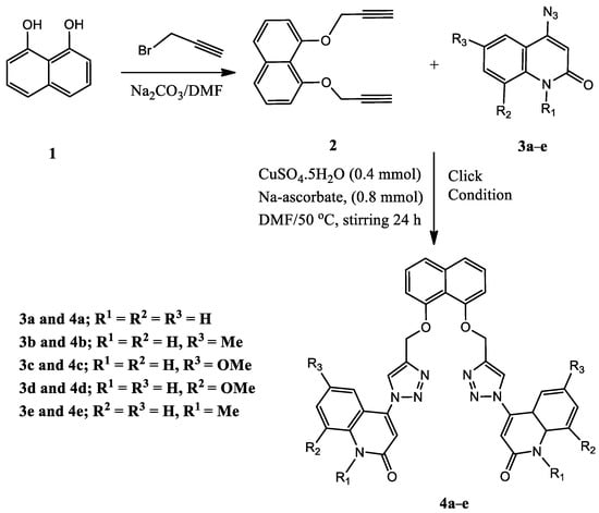 Scheme 1 and Scheme 2 depict the synthesis of compounds 4a–e and 7a–e via the cycloaddition reaction of the obtained 1,8-bis(prop-2-yn-1-yloxy)naphthalene (2) [31], or 1,5-bis(prop-2-yn-1-yloxy)naphthalene (6) with different readily prepared azides of quinolinones 3a–e [32,33,34,35,36]. The cycloaddition reaction of azide–alkyne was performed in DMF via click conditions to afford a series of five different Syn-like quinolinone-dioxo-naphthalene hybrids via triazole linker 4a–e. The characterization data, including 1H NMR, 13C NMR, 1H-1H COSY, HMBC, HSQC, and 15N NMR spectroscopy, mass spectrometry, and elemental analysis, confirmed the chemical structures of our new synthesized compounds 4a–e.