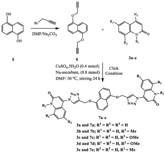 On the other hand, the same synthetic methodology was used to produce a new series of bis-quinolinone-1,2,3-triazole hybrids as more analogs for biological testing. The cycloaddition reaction of 4-azido-2-quinolinones 3a–e with highly symmetrical di-o-propargylated compound 6, obtained by propargylation of 1,5-dinaphthol (5), was promoted under an above similar condition, resulting in 76–84% yield of the corresponding symmetrical bis-quinolinone triazole-based anti-like targets 7a–e (Scheme 2). The core architecture of these bis-quinolinone-triazoles and their diversity tempted us to study the anti-cancer properties of such compounds.