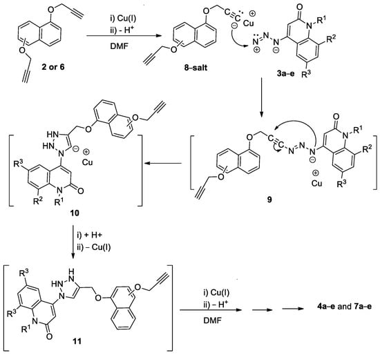 The mechanism for the obtained products 4a–e and 7a–e can be rationalized as, upon mixing (1 mmol) of terminal alkynes 2 and/or 6 with Cu(1), the salt of compound 8 would form. On the addition of (2 mmol) of azides 3a–e dissolved in DMF, a nucleophilic addition takes place to give the adduct 9, which undergoes nucleophilic attack to the N-negative charged on triple bond to give the adduct 10, which then further accepts H+ and forms the intermediate 11, which then reacts with Cu(1) to give the final products 4a–e and 7a–e via further repeating the above steps as shown in Scheme 3 [23,40].