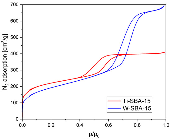 Nitrogen sorption isotherms of Ti-SBA-15 and W-SBA-15 are presented in Figure 2. Both isotherms displayed type IV with H1-type hysteresis loops typical of mesoporous materials with one-dimensional cylindrical pores [8]. The position of the hysteresis loop and the sharpness of the adsorption–desorption branches were different. The position where the hysteresis begins is relevant to pore sizes. The hysteresis loop of Ti-SBA-15 was placed in the range of p/p0 from 0.4 to 0.7. The hysteresis loop of W-SBA-15 was placed in the higher range of p/p0 from 0.57 to 0.87, and was distinctly sharper. The comparison of isotherm shapes indicated that W-SBA-15 exhibited much wider pores and a higher pore volume than Ti-SBA-15.