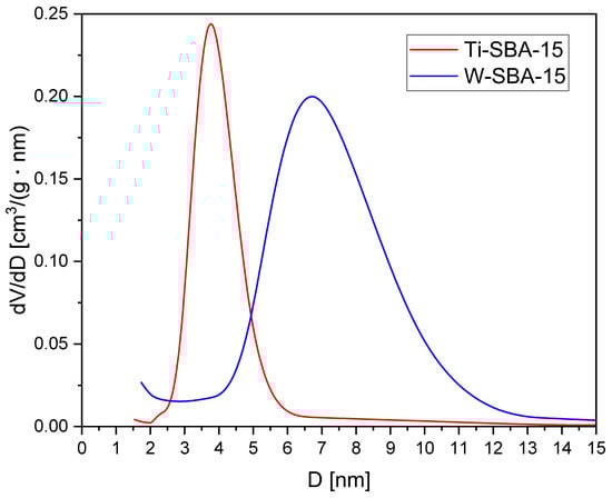 These conclusions are consistent with the BJH pore size distribution results presented in Figure 3 and the textural properties shown in Table 1. The pore size distribution for both samples was quite narrow: 2–6 nm for Ti-SBA-15 and 4–11 nm for W-SBA-15. The most common pore diameters found based on the maximum pore size distribution calculated using the BJH method were equal to 3.8 and 6.7 nm for the Ti-SBA-15 and W-SBA-15 catalysts, respectively. The widening of the pore size for W-SBA-15 is proof that part of the tungsten was incorporated into the SBA-15 structure. The W atomic radius is higher than Ti.