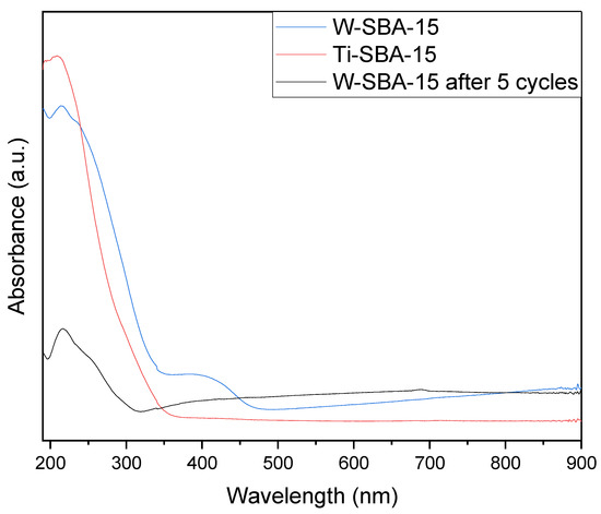 Figure 5 shows the Dr-UV-Vis spectra of the catalysts studied. In both cases, there was an absorbance maximum occurring around 220 nm associated with a ligand-to-metal charge transfer of isolated tetrahedral species, indicating effective incorporation of W and Ti atoms into the SBA-15 structure (this is proof of the presence of highly dispersed titanium and tungsten species in a silica framework). In the spectra of W-SBA-15, a low-intensity band at 250 nm (attributed to W6+) is also visible. This band indicates that partially polymerized W species with octahedral coordination and isolated W species with tetrahedral coordination coexisted in the support. In the W-SBA-15 materials spectrum, an additional peak with a maximum of around 420 nm is noticeable, probably associated with the presence of extra-framework WO3 clusters [16]. In the spectrum of the W-SBA-15 catalyst examined after five cycles, a decrease in the intensity of the 220 nm and 420 nm bands is clearly visible, which indicates the leaching of both W species incorporated into the SBA-15 structure ([WO4] tetrahedral species) and WO3 embedded in the catalyst pores. The UV-Vis results confirmed the XRD findings.