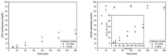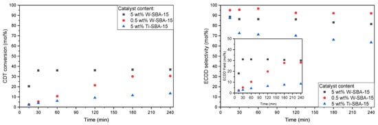Additionally, in the case of the selectivity of the transformation of CDT to ECDD (Figure 7), a significant advantage of the W-SBA-15 catalyst in comparison to the Ti-SBA-15 catalyst was visible. In the case of running the process with the 5 wt% catalyst, for the W-SBA-15 material, a roughly 15 mol% higher value of ECDD selectivity was obtained for almost the entire duration of the process (except for 15 min). The highest selectivity was obtained by conducting the process with the 0.5 wt% W-SBA-15 catalyst.