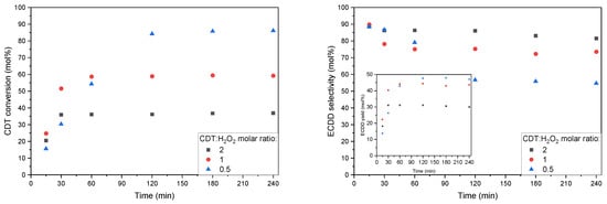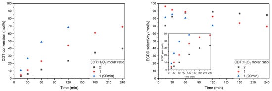 Figure 11 shows the results of the studies on the effect of changing the CDT:H2O2 molar ratio and the H2O2 dosing rate. It can be seen that, similar to the batch conditions, the amount of H2O2 added to the reactor is crucial for the increase in the rate of CDT conversion as well as for the ECDD selectivity.