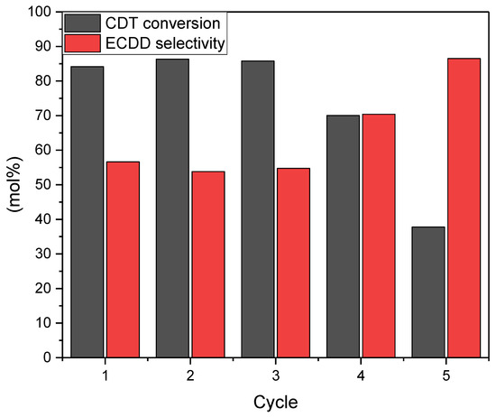 Graph showing changes in CDT conversion and selectivity of CDT to ECDD conversion as a function of the number of catalyst cycles. Process conditions: temperature, 60 °C; solvent, i-PrOH, 90 wt%; CDT:H2O2 molar ratio (60 wt% aqueous solution), 0.5; catalyst, W-SBA-15, 5 wt%.