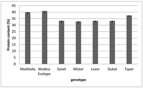 Figure 1 shows that the protein content was quite uniform between the different samples. The highest value was found in the Modica ecotype (40.8%) and the lowest in cv. Mister (32.75%).