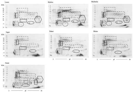 Each group of identified proteins is reported in Figure 2 using the following depictions: solid-line rectangles indicate the acidic and basic subunits of α-conglutin/legumin; dash-and-dot rectangles indicate the β-conglutin/vicilin family protein spots; dotted ovals indicate δ-conglutin/vicilin; solid-line ovals enclose both the large and small subunits of γ-conglutins; and, finally, the solid-line hexagons enclose the subunits of both β- and γ-conglutins.