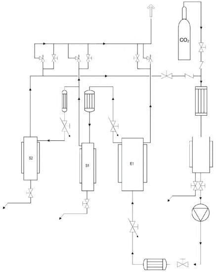 The employed supercritical fluid extraction (SFE) equipment is located at the technological pavilion of the CREA Research Center for Olive, Fruit, and Citrus Crops (Acireale, CT, Italy) and is entirely composed of AISI 316 L steel (Separeco s.r.l., Pinerolo, TO, Italy) according to the European Commission regulations for pressure systems (PED—Pressure Equipment Directory). Figure 4 shows a scheme of the plant. It consists of an extraction reactor (E1) and two separators (S1 and S2). The reactor has a volume of 1 L, while the separators have a volume of about 0.2 L each. The CO2 pump has a max flow rate of 5.78 L/h. The operating pressures can vary from 60 to 300 bar. The safety valves are therefore calibrated for opening above 330 bar. The system is thermostated using boiler and chiller integrated systems. Full-fat lupin seeds belonging to the different genotypes were previously oven dried at a mild temperature (<45 °C) and further milled to a fine powder by a domestic grinder so that the final particle size was ≤150 µm. Prior to the SC-CO2 defatting process, an aliquot of 40 g of dried full-fat lupin seed flour of the different genotypes was used to determine the oil fraction by Soxhlet extraction for 5 h using hexane as the solvent. Then, the obtained lupin seed flour samples were lyophilized before being subjected to the defatting process by SC-CO2. In order to improve the oil extraction yield, about 300 g of the lyophilized samples was manually blended with ethanol as an entrainer at a rate of 15% (w/w), before being placed in E1, previously set at the desired temperature (T = 40 ± 1 °C). CO2 (99.95% grade purity) was subcooled in a cooling system in order to be pumped as a liquid by the pump (Lewa, max flow 5.78 L/h) and then directed into E1 until the desired pressure was reached (P = 300 bar). SC-CO2 was allowed to flow continuously through E1 for 6 h at a rate of 5.176 kg/h. The oil was collected in a flask immersed in an ice bath at around 5 °C.