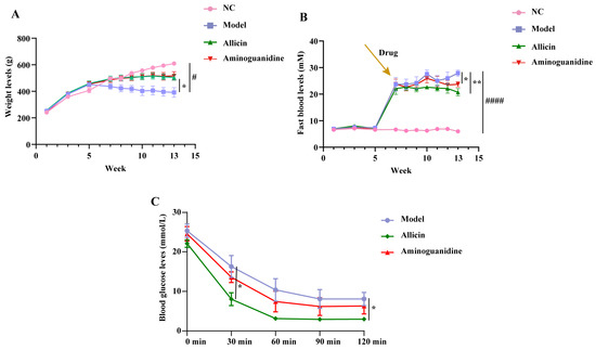 2.1. Allicin Alleviates Metabolic Dysregulation in Rats with STZ-Induced Diabetes