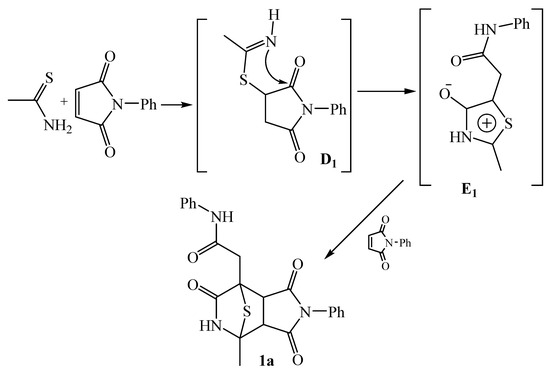 The reactions of the simplest 1,3-N,S-binucleophile thioacetamide with N-arylmaleimides are described in only one publication [23]. The authors reported an unusual course of the reaction of thioacetamide with N-phenylmaleimide when the initial reagents were heated under nitrogen in dioxane. They showed that two molecules of N-phenylmaleimide are involved in the reaction with thioacetamide. It was reported that this interaction proceeds as a cascade process. In the first stage, a thiazole E1 is formed, which then acts as a 1,3-dipolarophile and reacts with another N-arylmaleimide molecule in the second stage to form 2-(4-methyl-1,3,6-trioxo-2-phenyloctahydro-7H-4,7-epithiopyrrolo[3,4-c]pyridin-7-yl)-N-phenylacetamide 1a [23].