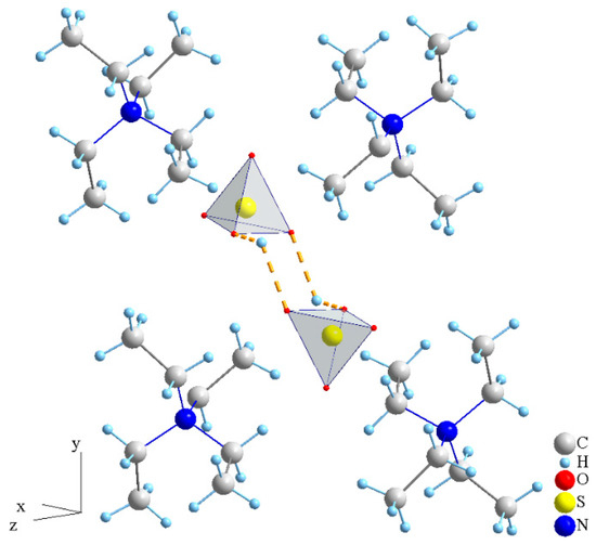 Et4N+ cations have the shape of a Nordic cross with S4 symmetry and are much larger than the anions. The symmetry of SO4 groups is close to tetrahedral, with small deviations in the O-S-O angle from 109.28° for an ideal tetrahedron. Two sulfate tetrahedra are linked into dimers by strong hydrogen bonds. The dimers are ordered into layers that are isolated from each other at a relatively large distance of 6.53 Å [26]. At T = 160 °C, the tetragonal phase I41/acd is formed with the unit cell parameters a = 14.0430 Å and c = 25.686 Å and exists up to the melting point of Et4NHSO4 [27].