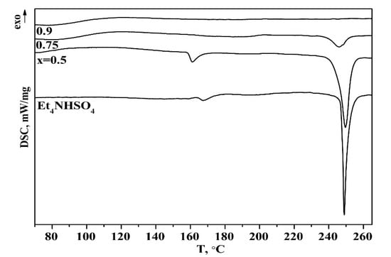 DSC data for Et4NHSO4 and the (1 − x)Et4NHSO4−xSiO2 composites are presented in Figure 5. It can be seen that the enthalpies of the endoeffects of the melting and phase transitions changed more significantly than the salt content in the composites and completely disappeared with an increase in x to 0.9. The temperature and enthalpy of melting for the composite when x = 0.5 were closer to the original salt (244.8 °C and -71.97 J/g, accordingly) and the enthalpy for x = 0.75 decreased markedly and was equal to -14.8 J/g. The temperature of melting shifted to 239 °C. The temperature of the phase transition also decreased to 158.7 °C. With the further increase in x to x = 0.9, the endoeffects due to the melting and phase transitions disappeared.