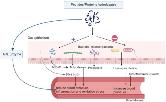 Dietary fibres are the main components of the diet that affect the gut microbiota meanwhile, secondary metabolites like polyphenols but also food-derived peptides can act alone or in combination with fibres to maintain the microbial balance [114,115]. Non-digested peptides can reach the intestinal lumen, where they will be in contact with microorganisms. It was reported that about 1% of gut microorganisms are amino acid-fermenting bacteria, while the colon can get about 3–12 g of proteins and peptides daily [13,116]. Gut bacteria appear to preferentially ferment peptides over free amino acids, with those belonging to Bacteroidetes having the greatest effects and yielding mainly propionate while the action of Firmicutes produces butyrate [117]. Table 1 summarizes available data to illustrate the relationship between food-derived peptides, gut microbiota modulation and blood pressure regulation.