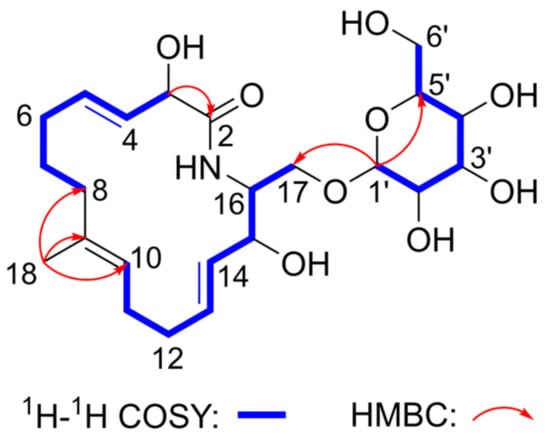 The 1H−1H COSY and HSQC data (Figure 2) suggested the presence of three spin systems in 1, (a) H-3/H-4/H-5/H2-6/H2-7/H2-8, (b) H-10/H2-11/H2-12/H-13/H-14/H-15/H-16/H2-17, and (c) H-1′/H-2′/H-3′/H-4′/H-5′/H2-6′. Additionally, HMBC correlations (Figure 2) from one methyl singlet H3-18 to C-8/C-9/C-10 suggested the direct connections of C-8, C-10, and C-18 toward C-9. The connection between C-2 and C-3 was verified by the key HMBC correlation from H-3 to C-2. The HMBC correlation from the H-1′ to C-17 established the connections of one glucopyranosyl group to the oxygenated primary carbon C-17. Furthermore, H-16 (δH 3.97)/C-16 (δC 54.7) were different compared to a typical oxygenated secondary carbon, thus, a nitrogen bridge exists between C-2 and C-16 according to the molecular formula and resulting degrees of saturation of 1. Notably, all three trans double bonds Δ4,5, Δ13,14, and Δ9,10 could be established by the coupling constants of JH-4/H-5 = 16.0 Hz, JH-13/H-14 = 15.1 Hz, and the key NOESY correlation between H-8 and H-10. Consequently, the planar structure of oxalactam A (1) was constructed as (4E,9E,13E)-3,15-dihydroxy-16-(glucopyranosyl-O-methyl)-9-methyl-azacyclo-hexadeca-4,9,13-trien-2-one.