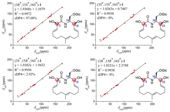 Linear correlation plots of calculated-experimental 13C NMR chemical shift values for (3R*,15S*,16S*)–1, (3S*,15S*,16S*)–1, (3S*,15R*,16S*)–1, and (3R*,15R*,16S*)–1.
