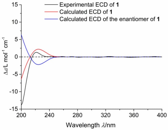 Experimental ECD for 1 and calculated ECD spectra for 1 and its enantiomer.