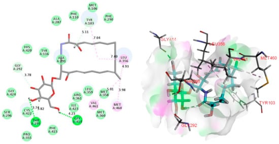 2D and 3D images of oxalactam A (1) with the target protein CYP51 (Pink dotted lines: Pi-Alkyl interactions, light green dotted lines: Van Der Waals interactions, deep green dotted lines: Conventional hydrogen bond).