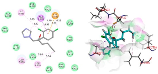 The 14α-demethylase enzyme (CYP51, PDB ID: 3GW9) [34] is an essential component of the fungal cell membrane, which played an important role in the fungal-specific ergosterol biosynthesis pathway. Azole antifungals (hexaconazole for example) could compete with the CYP51 substrate by binding to the heme iron in the active site in a ligand–binding pocket, leading to ergosterol depletion, membrane fluidity reduction, and lipid layer destruction [35]. To analyze the binding mode of compound 1 to CYP51 enzyme, molecular docking and dynamics studies have been performed using Discovery Studio 2019. The result illustrated that 18-methyl of 1 showed favorable steric interactions with LUE356, MET460, and VAL461 residues (Figure 6), and MET460 might cause a misfolded fungus-specific loop that affects the binding efficiency of the cognate NADPH-cytochrome P450 reductase [36]. Moreover, the 1,2,4-triazole and 1,3-dichlorobenzene moieties of hexaconazole were observed to generate interactions with the ALA291, CYS422, and ILE423 (Figure 7), and the ALA291 substitution is vital for the microbial resistance to triazole drugs including voriconazole and fluconazole [37]. Notably, it showed that the higher negative binding energy value of 1 (−202.0196 kcal/mol) compared to that of hexaconazole (−105.4279 kcal/mol) indicated more favorable binding interactions between compound 1 and the CYP51 enzyme (Table 3) [33], which could explain the reason for the superiority of compound 1 over hexaconazole.