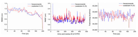 The steric interactions between CYP51 enzyme and oxalactam A (1)/hexaconazole were further estimated by molecular dynamics simulation according to RMSD (Root-mean-square deviation), RMSF (Root-mean-square fluctuation), and the total energy (Figure 8). Accordingly, RMSD values suggested that both complexes could reach an equilibrium state at 0.6–0.9 nm of the vibration amplitude within 200 ps. Additionally, the active and binding sites (THR295–LEU359/GLY414–VAL461) of CYP51–1 have a slightly higher RMSF than those of the CYP51–hexaconazole, indicating the CYP51–hexaconazole complex possesses better thermodynamic stability. Notably, the CYP51–1 complex showed lower total energy values than that of CYP51–hexaconazole with 55 kcal/mol per picosecond, which demonstrated that the binding affinity of CYP51–1 was much stronger than that of CYP51–hexaconazole. These results indicated that compound 1 could directly bind to the high-affinity catalytic areas of the CYP51 enzyme and yield stable enzyme–ligand complexes in the saline condition.
