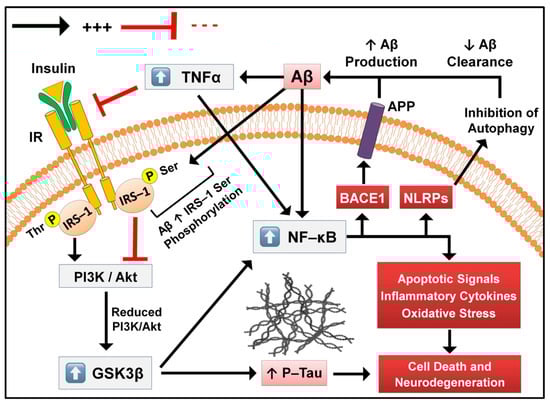 For instance, nuclear factor kappa b (NF-κB) activation was found to increase BACE1 expression and, in turn, Aβ production [25]. Moreover, triggers of canonical and/or alternative NF-κB signaling pathways, such as pro-inflammatory cytokines [26], pattern-recognition receptors (PRRs) [27], T- and B-lymphocytes [28] as well as tumor necrosis factor (TNF) receptor superfamily [29], were also found to correlate with the progression of AD; thus, highlighting the central regulatory role of NF-κB in relation to BACE1 expression. Interestingly, Aβ itself was also found to promote the activation of p65/p50 dimers of NF-κB and trigger the expression of pro-apoptotic genes [30]. Another example can be observed in insulin signaling, were Aβ impaired insulin-mediated responses via altering cellular levels and interactions of insulin receptors and low-density lipoprotein receptor-related protein-1 (LRP-1) in 3XTg-AD mice [31]. In addition, Aβ was observed to promote insulin resistance through promoting the serine phosphorylation of insulin receptor substrate-1 (IRS-1) [32], resulting in the reduction of phosphoinositide 3-kinase (PI3K) and protein kinase B (Akt) expression and enhanced glycogen synthase kinase-3 beta (GSK3β) activity [33]. Enhanced GSK3β activity was linked to the hyperphosphorylation of intracellular tau proteins leading to the development of neurofibrillary tangles [34]; accordingly, impaired insulin signaling was suggested to be a link between extra- and intracellular events in AD. GSK3β was also found to promote the activation of NF-κB and, in turn, sequential BACE1 expression and Aβ production [35]. Numerous other pathways have also been found to follow the same pattern, creating what appears to be a vicious cycle of endless events promoting the disease progression (Figure 2).