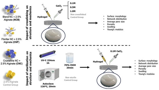 The impact of crosslinking and sterilization on mechanical and structural properties of nanocellulose-based hydrogels for cartilage tissue engineering. NCB: nanocellulose blend; CNC: nanocellulose crystals; CNF: nanocellulose fibrils. Adapted from reference [27] with permission. Copyright 2019 Elsevier.