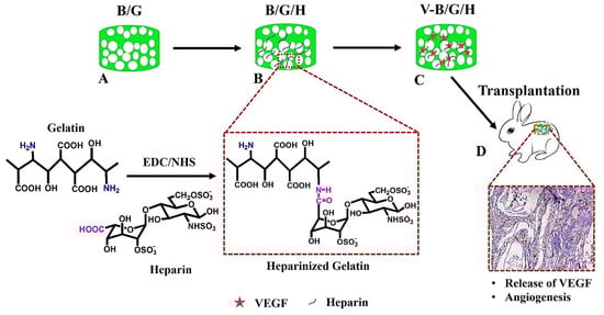 (A–C) The preparative strategy of VEGF-loaded 3D porous bacterial cellulose/gelatin scaffolds modified with heparin for vascularization and tissue regeneration purposes. After the condensation of the -COOH in the heparin and the -NH2 in the gelatin, the scaffolds could be prepared for (D) subcutaneous transplantation to provide enhanced angiogenesis. NHS: N-hydroxysulfosuccinimide; EDC: 1-Ethyl-3-(3-dimethylaminopropyl) carbodiimide hydrochloride; B/G: bacterial cellulose/gelatin; H: heparin. Adapted from reference [80] with permission. Copyright 2017 Elsevier.