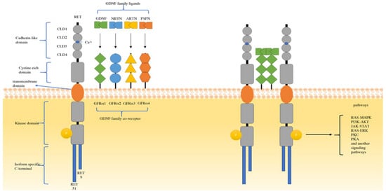 - Goodman, K.M.; Kjær, S.; Beuron, F.; Knowles, P.P.; Nawrotek, A.; Burns, E.M.; Purkiss, A.G.; George, R.; Santoro, M.; Morris, E.P.; et al. RET Recognition of GDNF-GFRα1 Ligand by a Composite Binding Site Promotes Membrane-Proximal Self-Association. Cell Rep. 2014, 8, 1894–1904. [Google Scholar] [CrossRef]